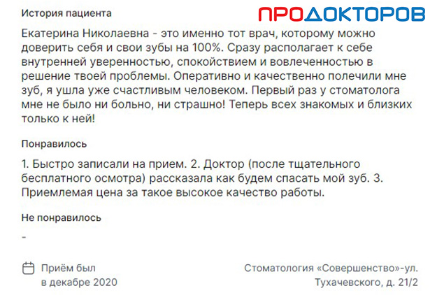 Екатерина Николаевна обладает обширными знаниями в области стоматологии, включая диагностику и лечение кариеса, пародонтита, пульпита и других болезней полости рта. Она обладает необходимыми навыками и знаниями, использует современные материалы и оборудование, чтобы обеспечивать лучшее качество лечения для своих пациентов.